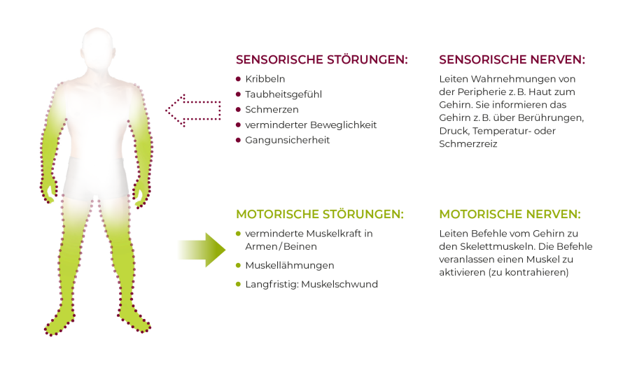 | Lähmungen (Paresen) äußern sich durch: | Empfindungsstörungen (Parästhesien) äußern sich durch: | Nervenschmerzen (neuropathische Schmerzen) äußern sich durch: |